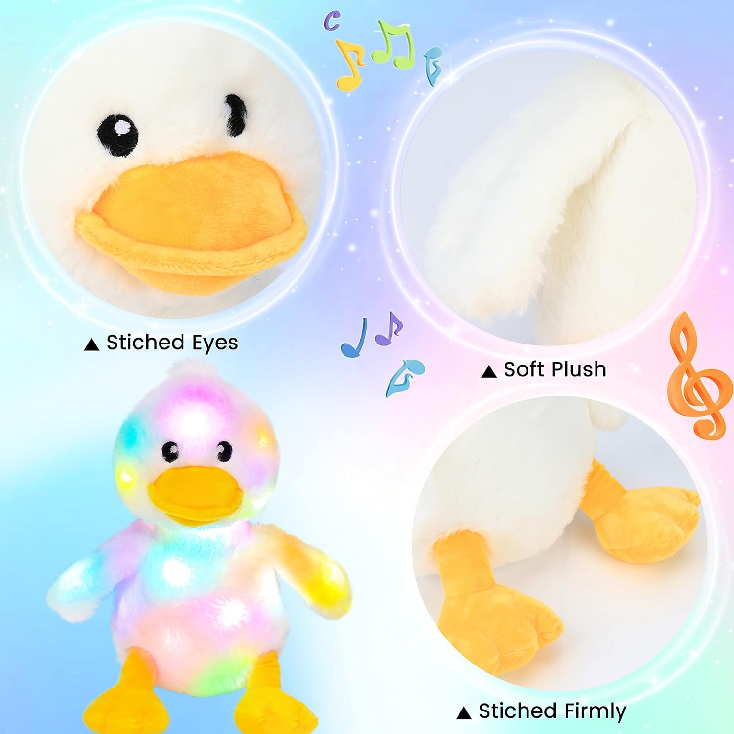 - MUSICAL LIGHT UP PLUSH: This stuffed animal glows in the dark. The magical duck features a soothing lullaby sound and a color-changing glowing effect. Light up your kid's dormitory and help reduce the anxiety caused by the dark in your little ones. There are 10 songs are contained. Your kids can learn to sing with it and will get much fun.