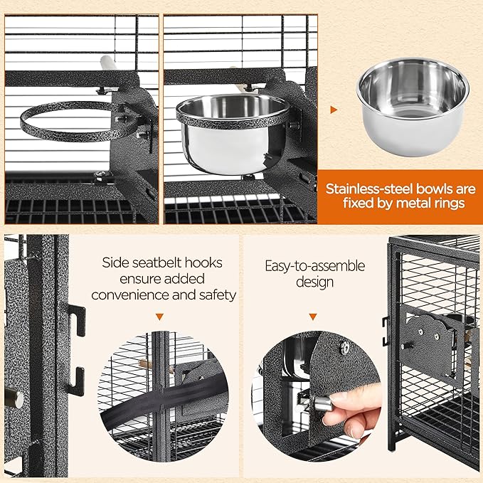 - Substantial Materials: Constructed from powder-coated wrought iron in a hammered finish, this bird travel cage boasts high strength, water resistance and all-around durability. The stainless-steel feeders provide a reliable feeding station for your birds