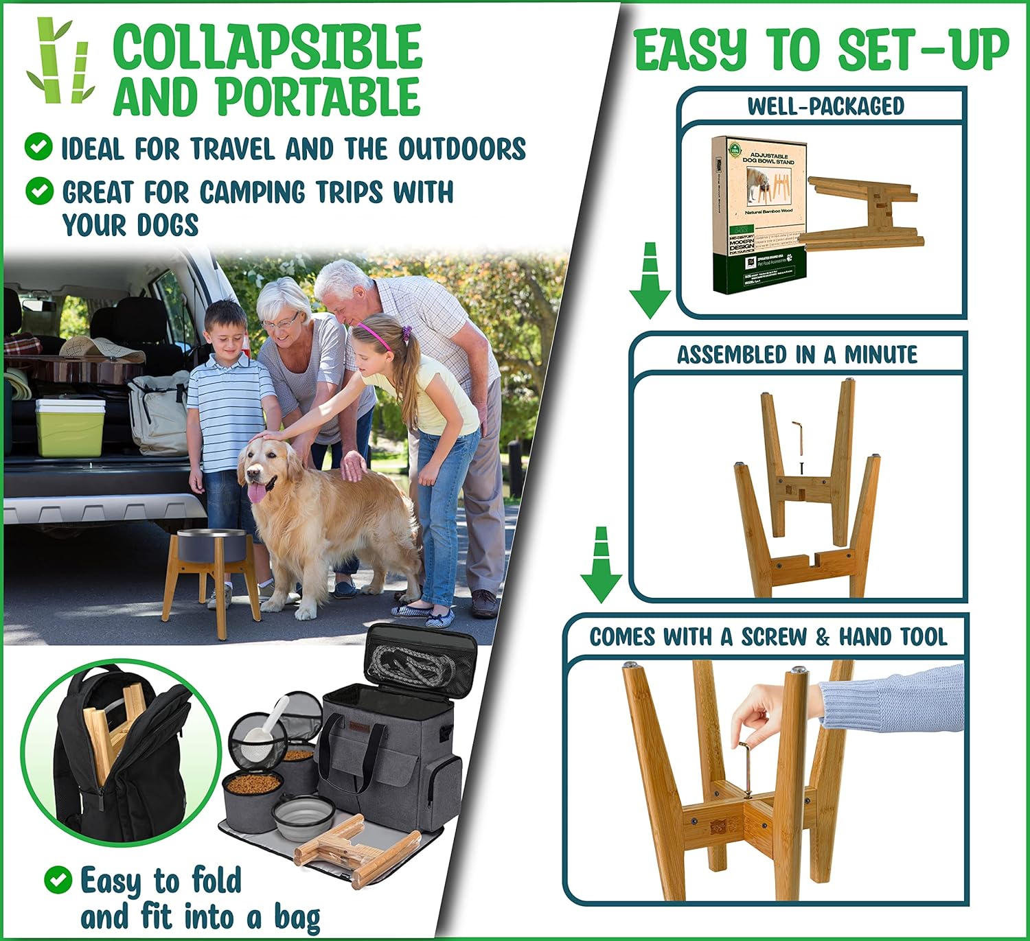 Dog Bowl Stand (14-inch High) - Ideal for Large Breeds, Use to Elevate, Raise Pet Dishes, Water Fountains and Slow Feeders - Adjustable Sideways, Bamboo - (Bowls not Included)