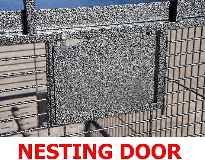 - Four Stainless Steel Cups With Swivel Solid Metal Plate Feeder Doors Prevent Food Spillage Include One Top Swivel Solid Metal Breeding Door. One Natural Wooden Stand Perch.