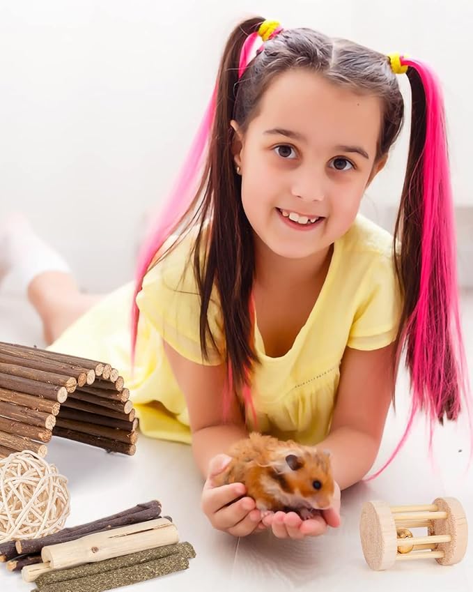 - ENTERTAIN&EXERCISE: The natural handmade chew toys set can be very attractive for most of the rodent animals.They will be thrilled and have a good time playing and chewing. The wooden hamster bridge can be bended into different shapes to fit into the cage setup, creating an exciting playground for your little friends