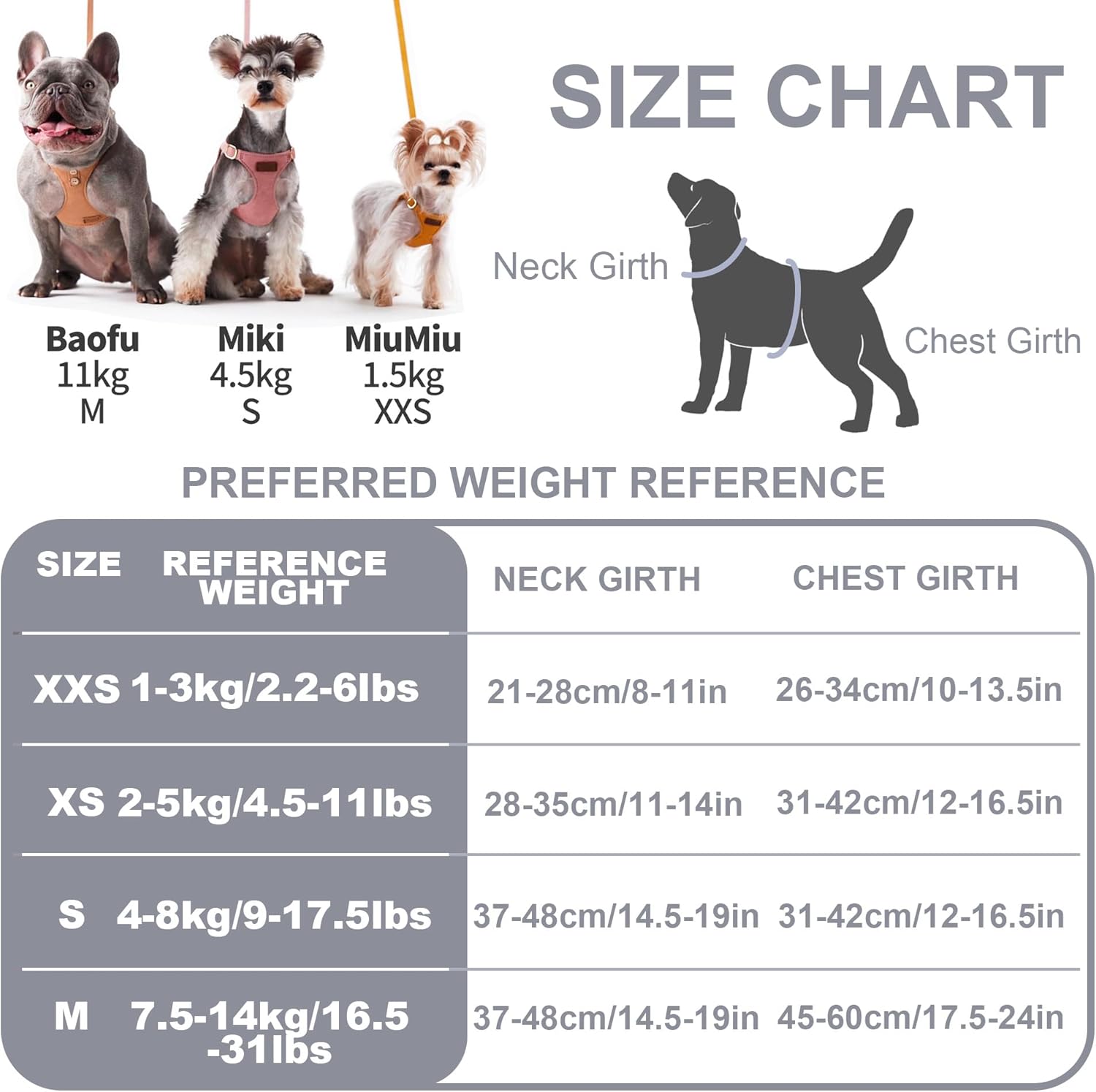 - No pull dog harness:No pull dog harness:Weight as low as 1.19 oz,undoubted ultra-light harness.Perfect tailoring design,patented rounded adjustment buckle,effectively protect the dog's bones and muscles during exercise to avoid injury.