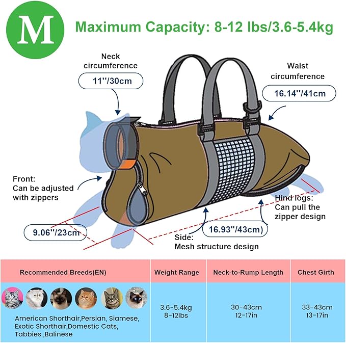 - Cat Grooming Bag with two rear zippers allow access to rear paws.