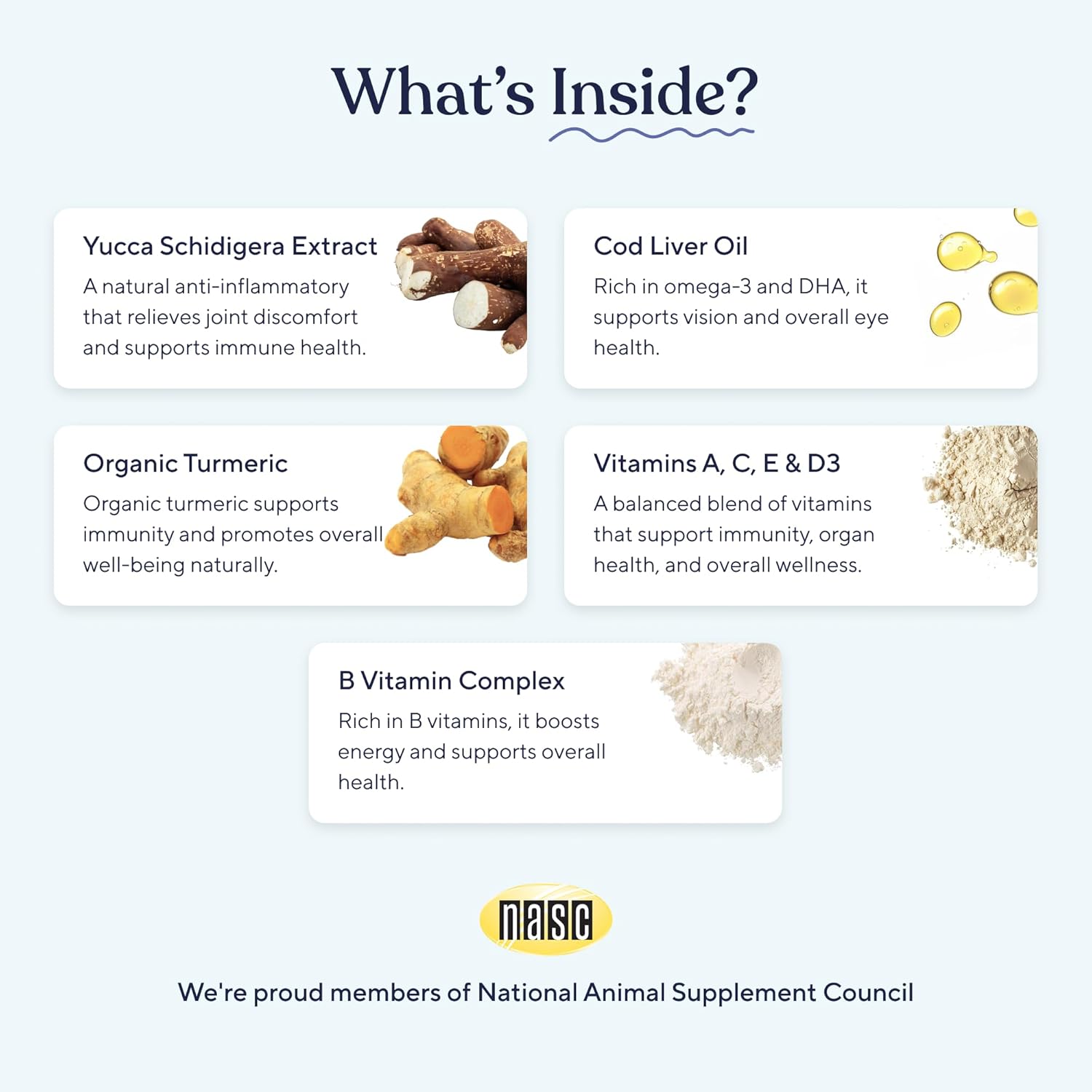 - Comprehensive Dog Multivitamin Blend: Packed with 15 carefully selected ingredients, including essential Vitamins A, B, C, D, and E, antioxidant-rich Turmeric, and nourishing Cod Liver Oil, our supplement is designed to support your pet’s overall well-being. This synergistic formula promotes vitality and helps maintain health throughout every stage of life.