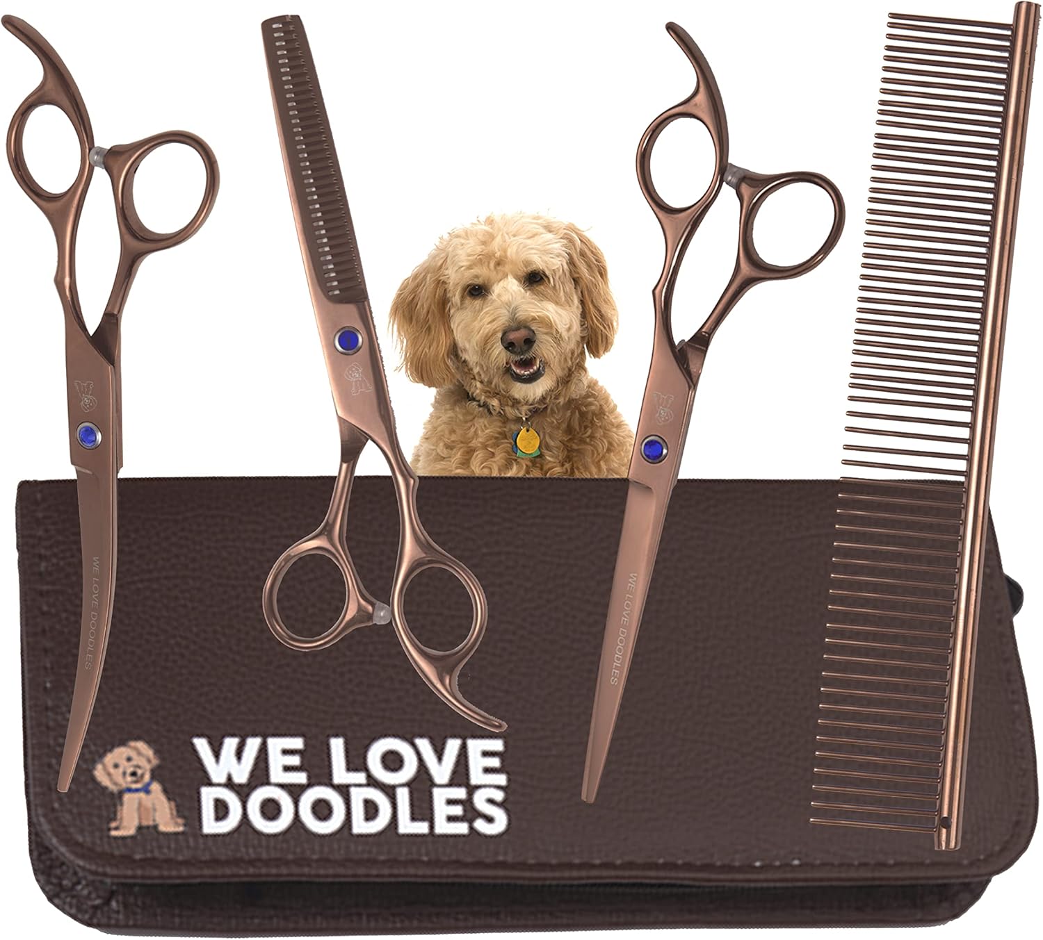 Dog Grooming Scissors Kit - Best Tools For Goldendoodles, Poodles & Doodles - Straight, Curved & Thinning Shears - Golden Doodle Grooming Kit - Professional Grade Steel, 4 Pc Set [We Love Doodles]
