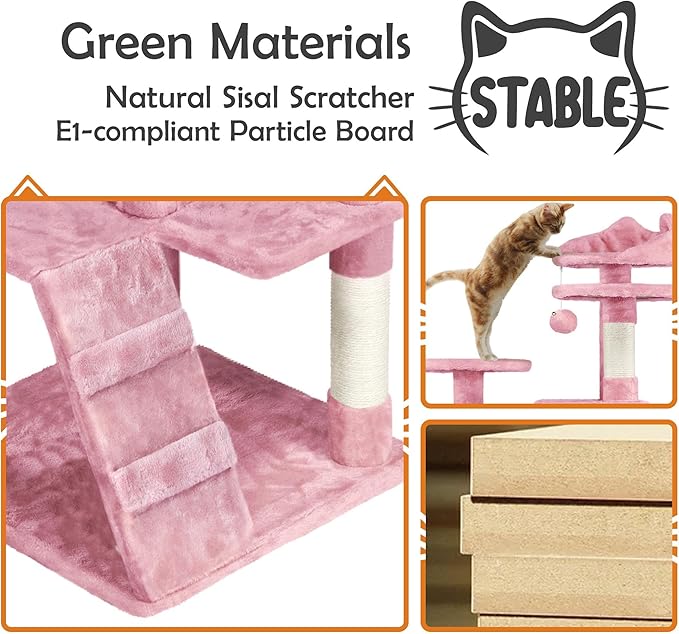 - Pet-Friendly Materials: Made of CARB P2-compliant manufactured wood, covered by skin-friendly plush, and connected by metal accessories, our cat tower is designed to bring a safe and stable entertaining center for your little angels