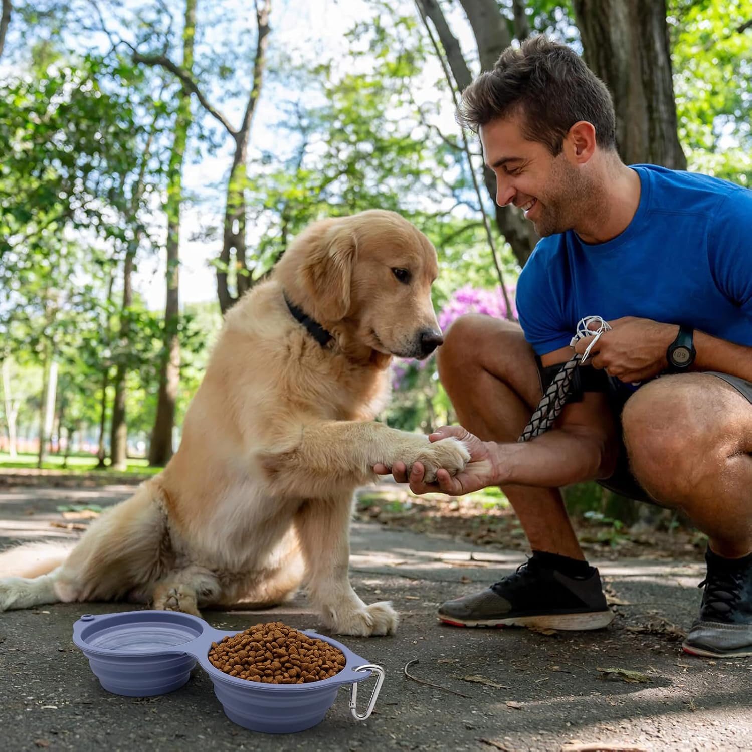 - INTEGRATED MOLDING DUAL BOWL: 2 IN 1 special designed collapsible dog bowls,feed your pets with food & water at the same time.Fold up the double bowls together, portable and more compact, save your space when travelling, walking with your dogs.