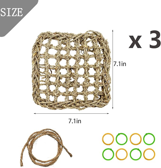 - 【Package Include】You will get 3 x bird seagrass mat, 8 x colorful ring buckles and hemp rope. Each seagrass mat measures about 7.1 x 7.1 inches. Perfect for various small and medium sized birds, such as parakeets, lovebirds, budgies, cockatiels, conures.