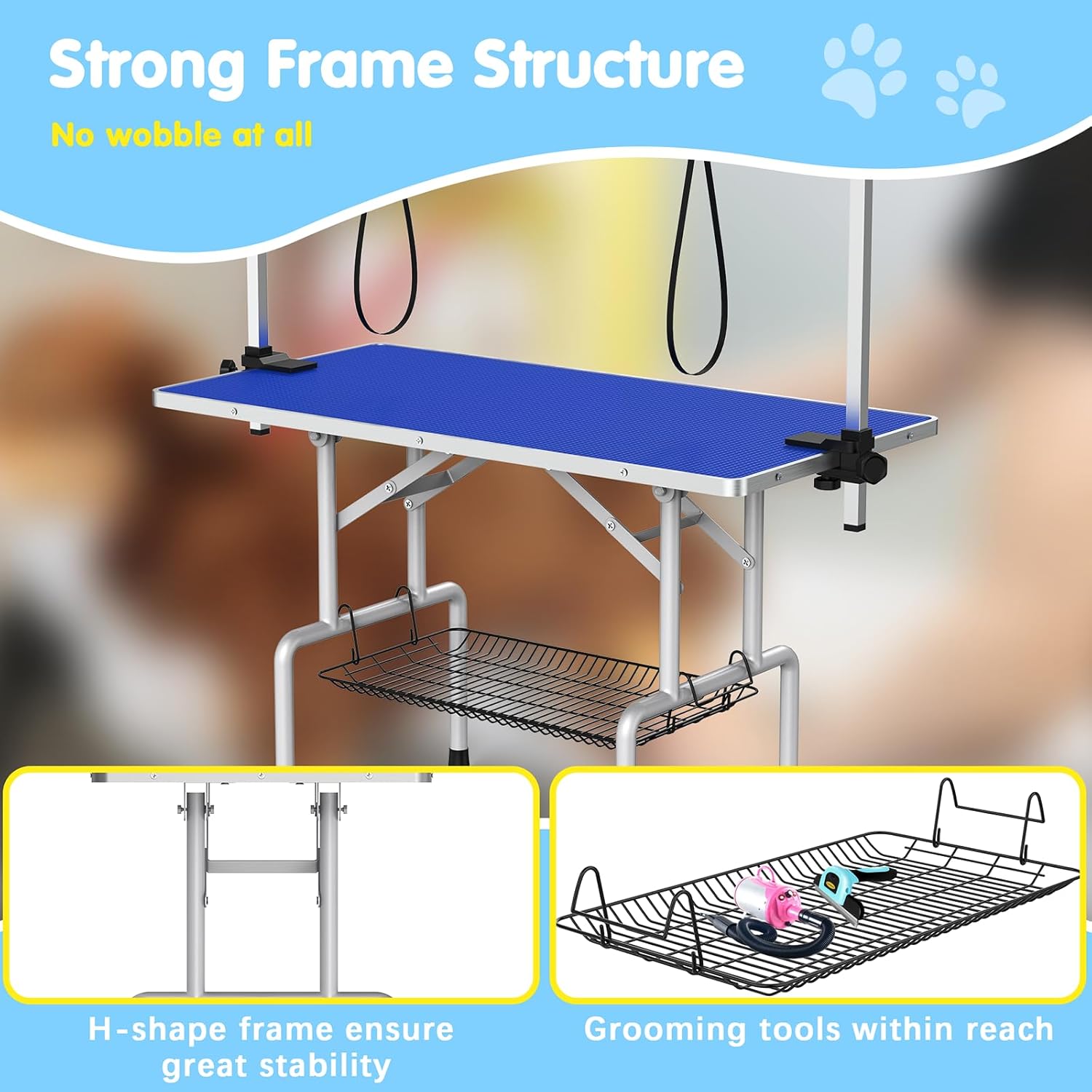 Lyromix 42''Large Dog Grooming Table, Adjustable Cat Drying Desktop with Arms, Nooses, Mesh Tray, Foldable Pet Station at Home, Maximum Capacity Up to 330Lb, 42inch, Blue