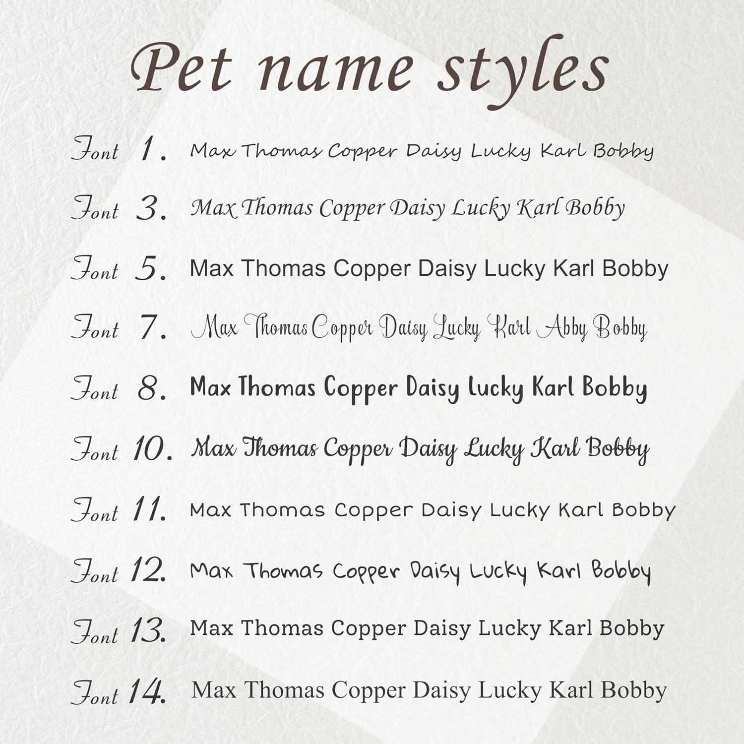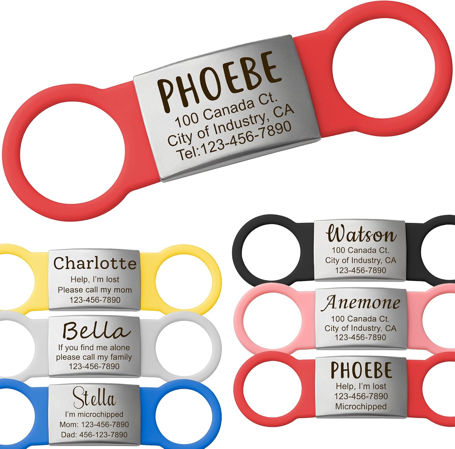 - Customized Fun Multiple Font Silent Pet ID Tags - No Jingling silicone band laser engraved stainless steel pet tags with your pet's name and contact infomation. A well-designed cute fashion name tag for your beloved dog, cat, or other pets. Handmade with love.
