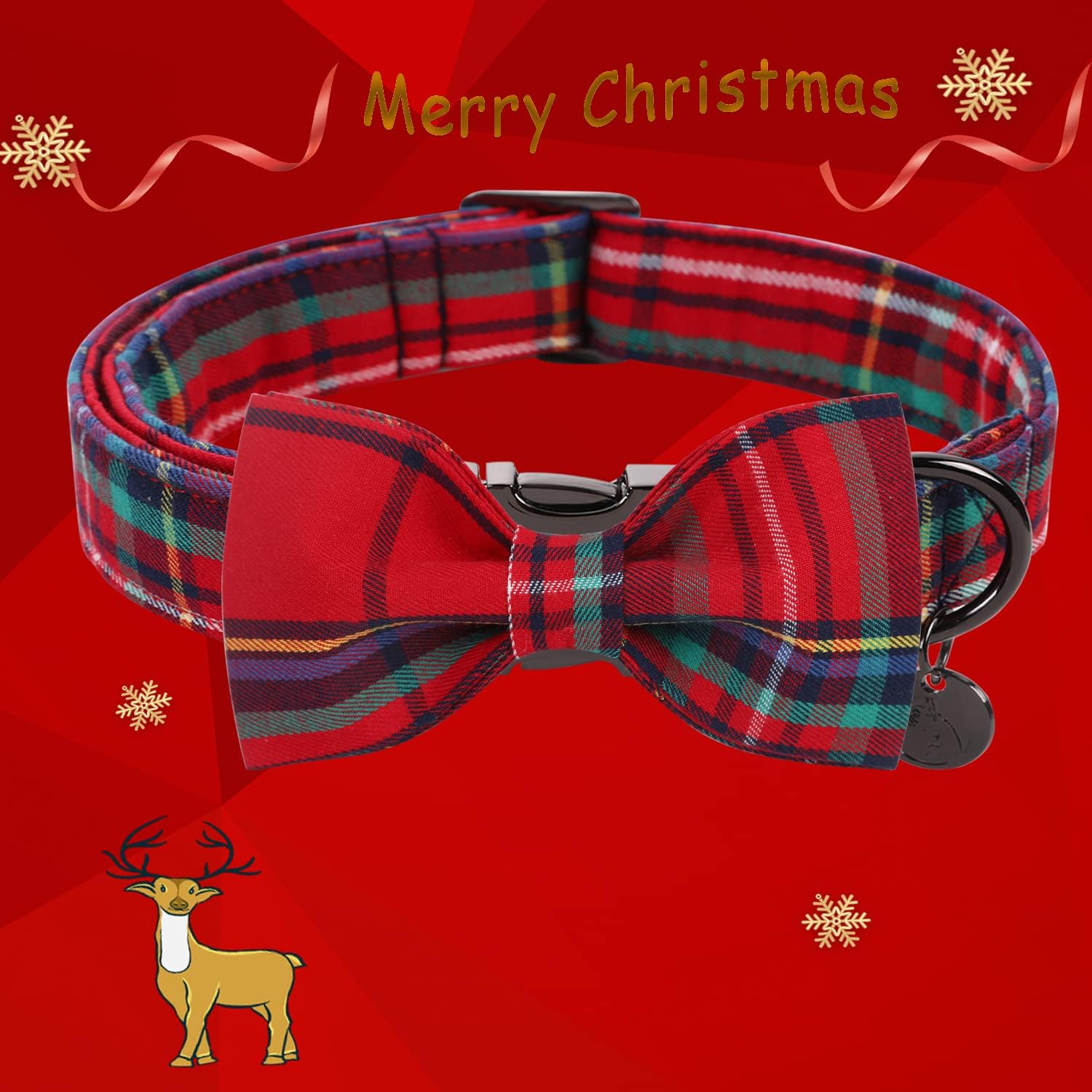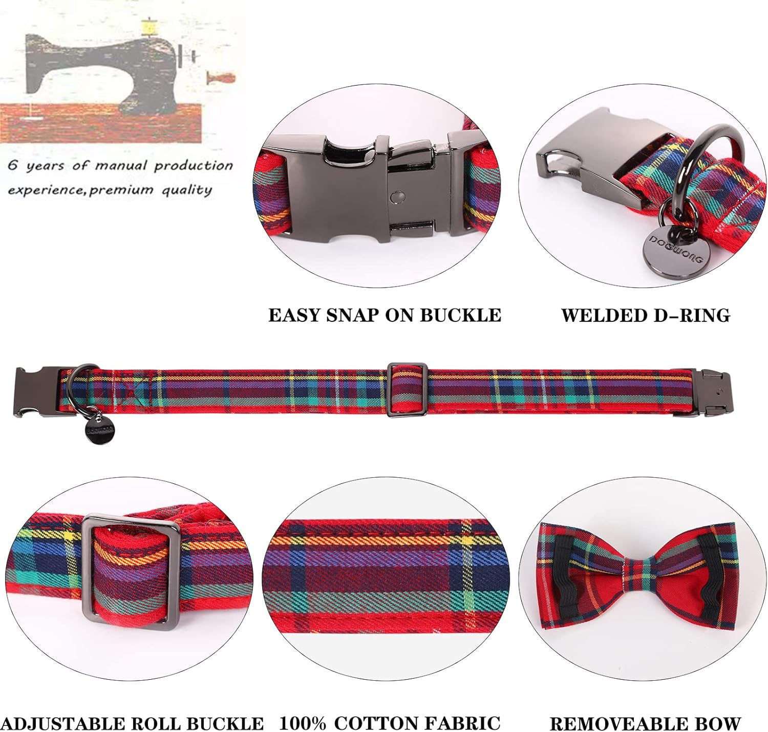DOGWONG Christmas Dog Collar with Bow tie, Red Plaid Dog Collar Soft Durable Adjustable Cotton Red Tartan Gingham Puppy Collar for Small Medium Large Dog