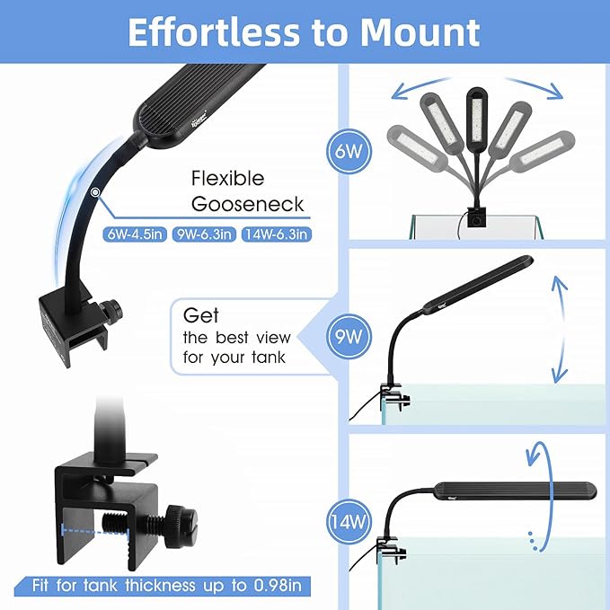 - Flexible Gooseneck & Simple Clip: This fish tank clip lamp has a 6.3-inch length of 360° flexible gooseneck tube you can easily adjust the light angle and direction. Upgrade a metal clip bracket with a screw for tightening, which securely for framed or frameless aquarium thickness up to 0.98 inches