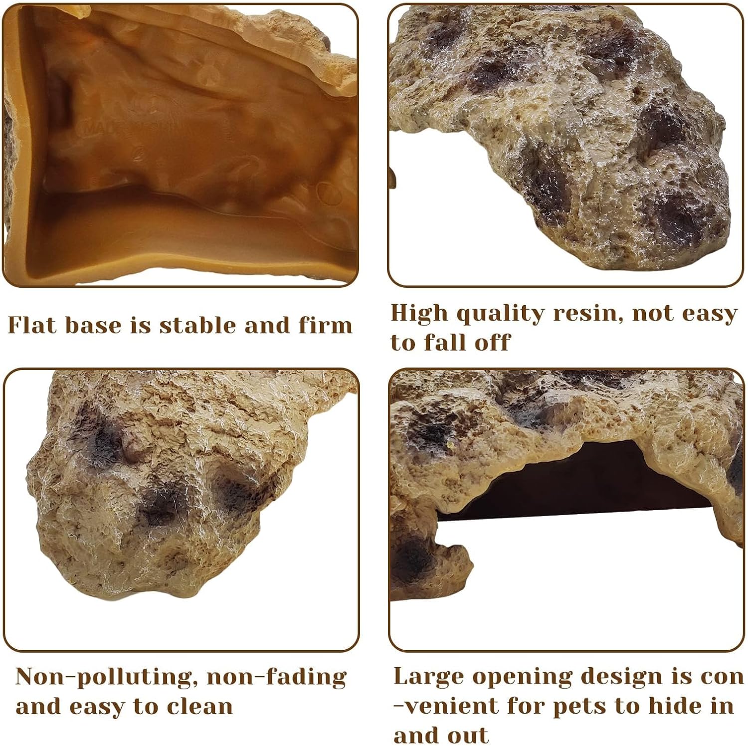 - Perfect Terrarium Habitat Decor : Hamiledyi reptile rock hide cave has natural appearance and real rock texture, reptile hide has a wide 3.94 inch, high 1.97 inch entrance to meet them to sleep, rest, hide, play and breed. The amphibian hideout cave provides a comfortable and safe hut that can reduce the stress of reptile pets stimulate appetite and allow them to grow up happily