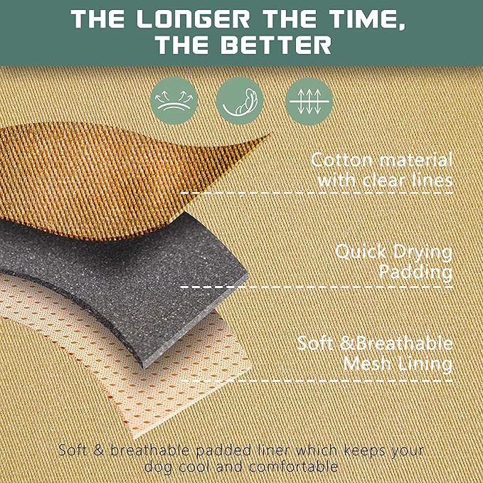 - ๐พDUARABLE & BREATHABLE MATERIAL: All Day Comfort.๐พ The heavy-duty vest made of soft cotton fabric with clear texture for the beautiful appearence. Extra durability and wear-ability, suitable for all field use. The soft padding can protect your dog's skin, while the breathable air mesh keeps your dog ventilated and comfortable. We will protect the comfort and health of the dog together with you.