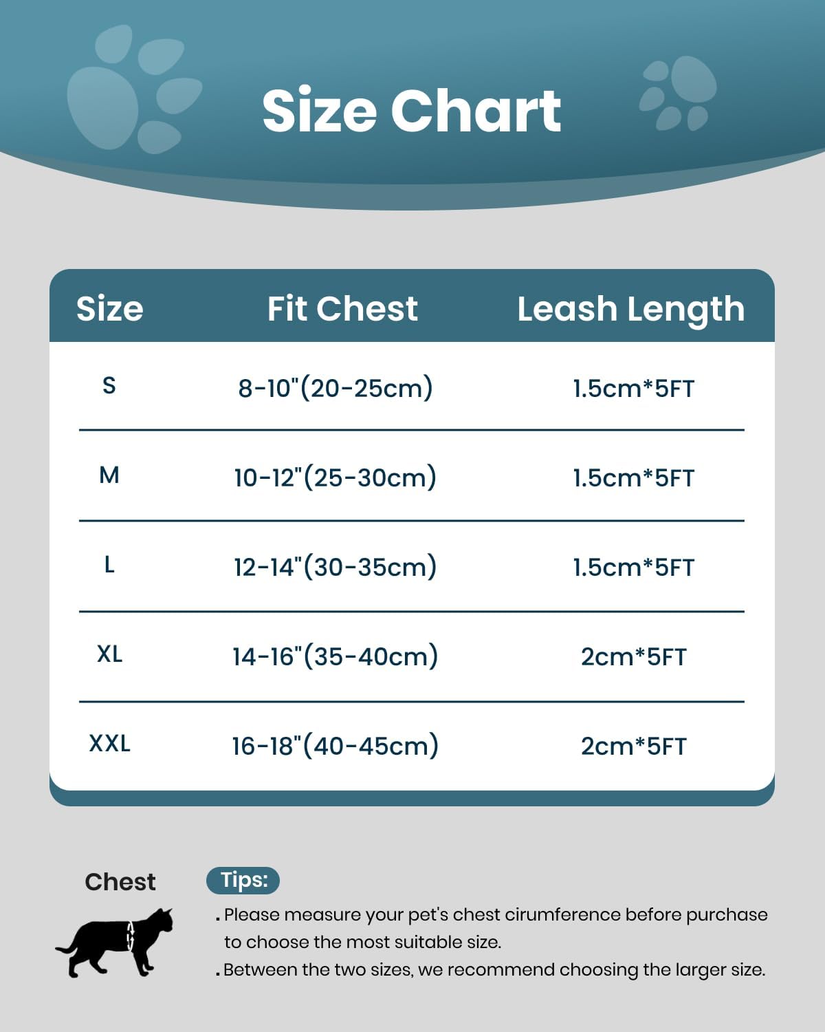 - TIPS FOR CAT HARNESS: We are now upgrading our cat harness with more size and color choices! Please measure your cat's chest and choose suitable size refer to the size chart before purchasing our cat harness and leash set, there may be some differences between different breeds of cats. This harness also suit for small dogs, the same please measure your dog's chest before purchasing this harness and leash escape proof