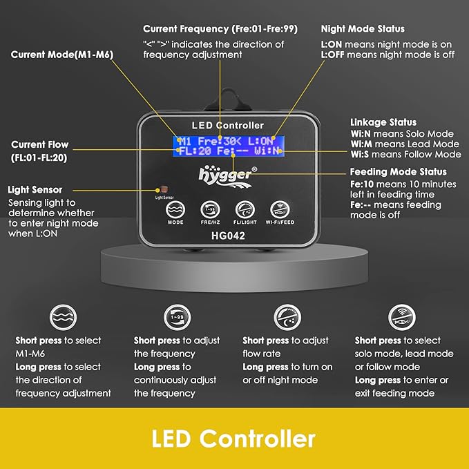 - ๐ใ6 Wave-making Modesใhygger inverter wavemaker pump has 6 wave-making modes, 20 levels of wave strength and 99 flow interval option, which can be adjusted through the LED controller. The propeller impeller has strong power and large water flow, simulating the natural river environment, allowing fish to swim as if in the wild.