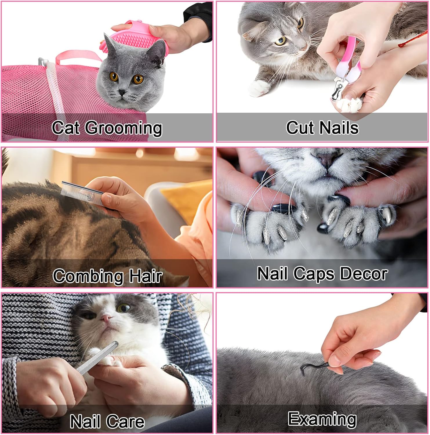 - Product Contents: The cat bathing bag set includes 2pcs cat shower bags of different colors( pink and gray),1pcs pet comb, 1ps shower brush, 1pc pet nail tweezers, 1pc nail, 1pc cat nail cap and 3pcs pet insect catchers. The pack contains full set of tools for pet bathing, very convenient to use.