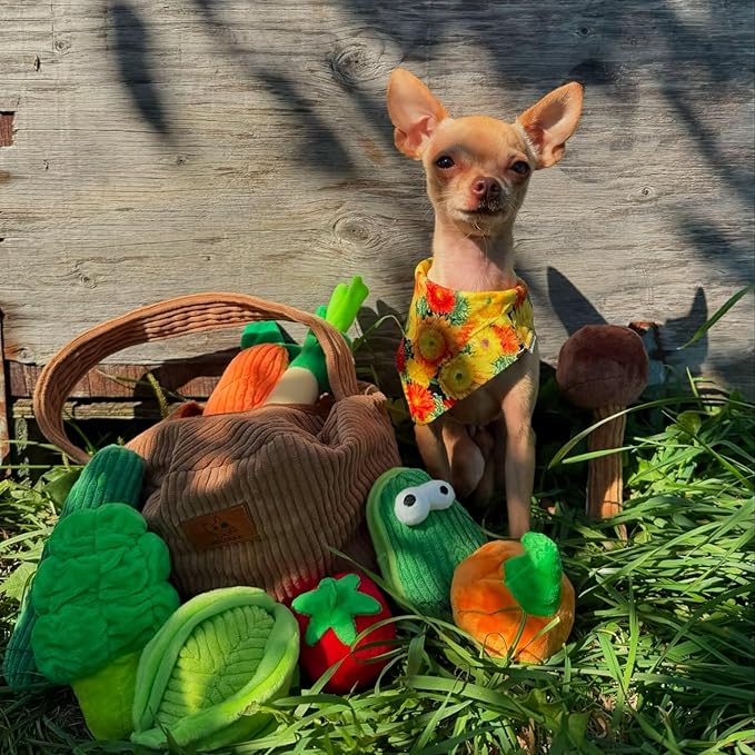 - 15 Pack Squeaky, Crinkly and Interactive Fun:All the small dog toys has one built-in squeaker or crinkle paper, which can engage your dogs' curiosity. And the various cute fruits and vegetables shapes keep your dogs busy all day long