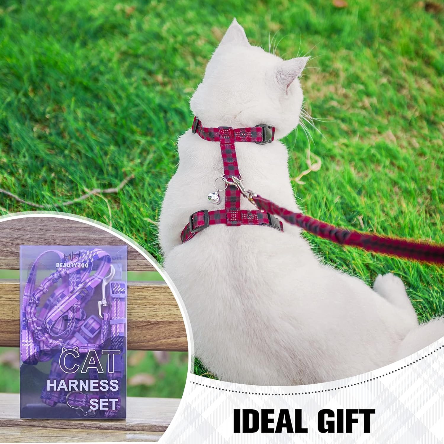 BEAUTYZOO Cat Harness and Leash Set Escape Proof for Walking, Kitten Soft Adjustable Vest Harnesses for Small Medium Large Cats, Easy Control Breathable Plaid Ribbon Nylon for Outdoor Indoor Use