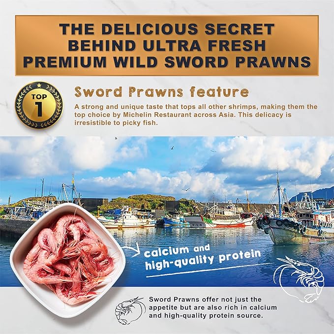 - High Palatability : Sword Prawn Flavor - A blend of wild sword prawns, akiami paste shrimp, vegetables and seaweed. A perfect 6:4 meat/vegetable protein ratio