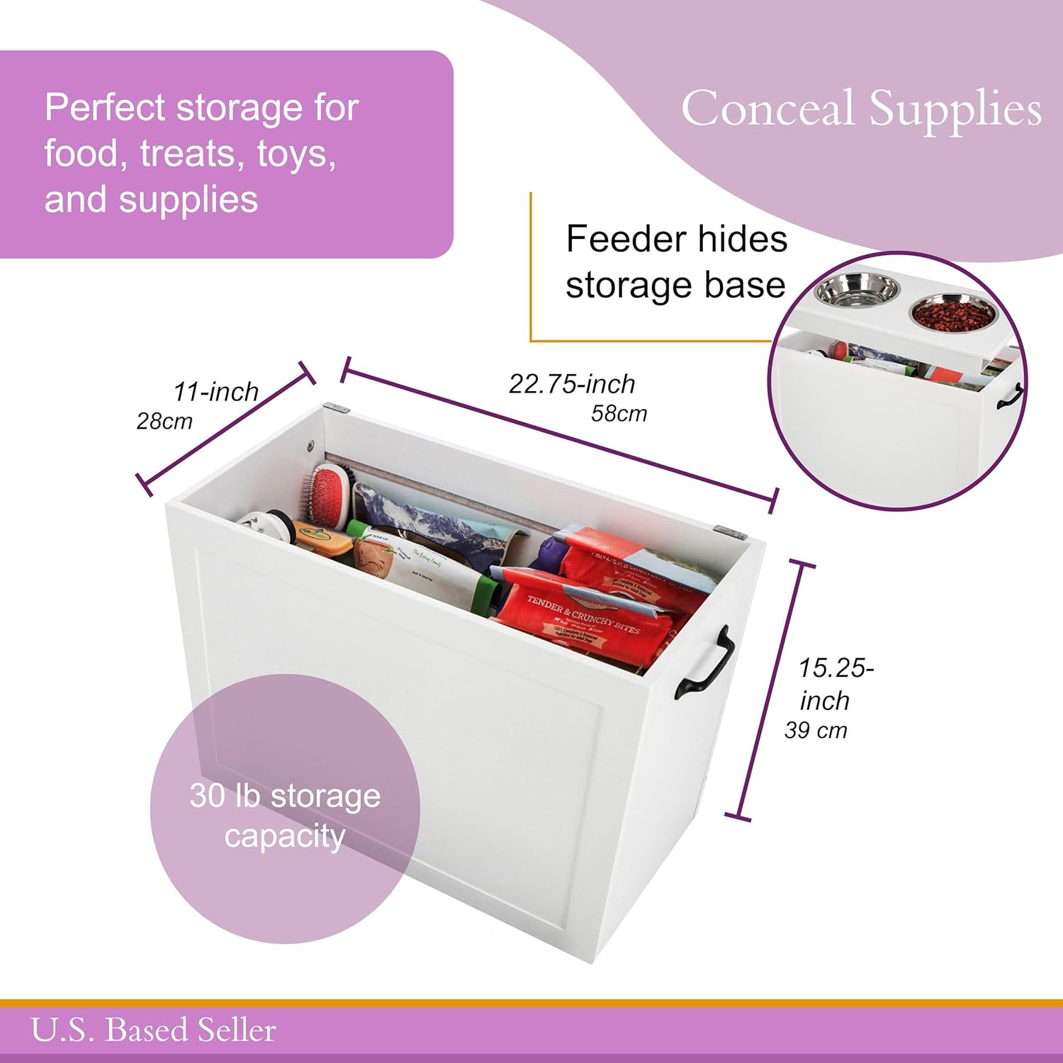 - [Trusted Quality]: Tall dog bowl stand made with white P2 grade MDF wood base and stainless steel bowls for indoor use; 30-pound (14kg) bottom compartment capacity, 50-pound (23kg) top surface capacity, 2.2-pound (1kg) bowl capacity