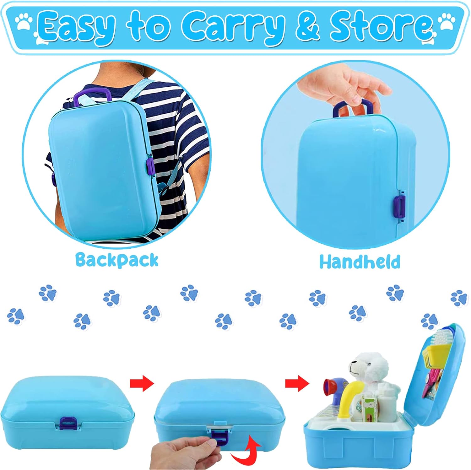 - Superior Quality Pretend Play Toys: Made from premium ABS materials, this pet care playset is durable enough to play with. All pieces are designed with smooth edges to prevent scratching kids. Also, the pet carrier backpack comes with adjustable straps to fit children of different heights and is easy to carry