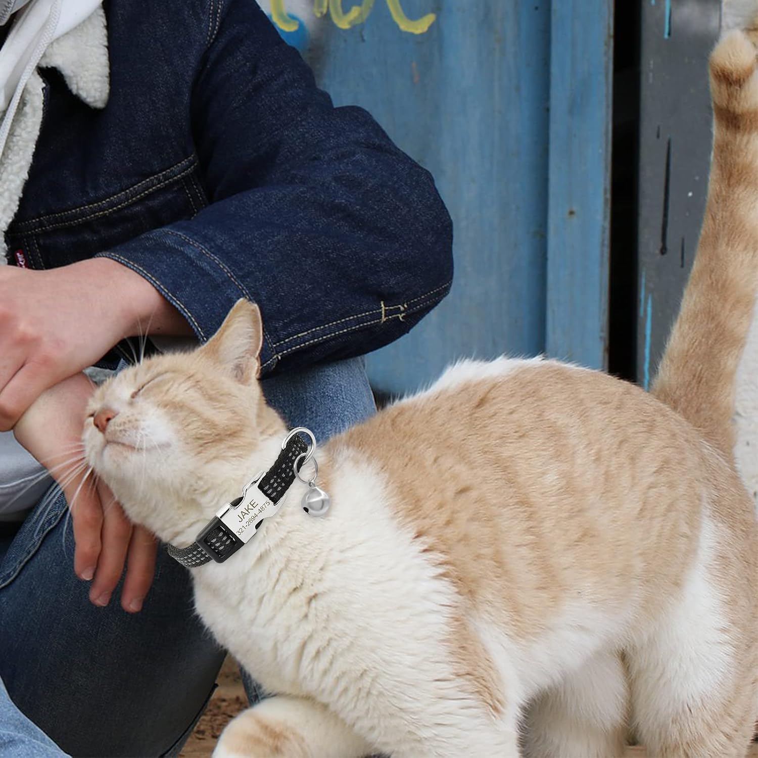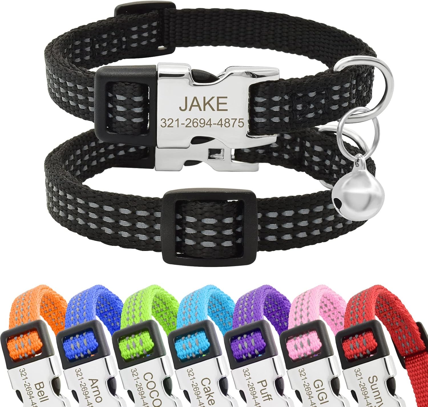 Personalized Reflective Nylon Cat Collar with Name Phone,Custom Engraved Buckle Cat Collar with Bell,Adjustable for Small Dogs Puppy Kitten (Black,fit 7.5''-12.0'')