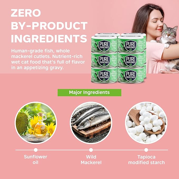 Pure Cravings Wet Cat Food Canned Mackerel Cutlets in Gravy, Every Catch is Mercury Tested, Moist Can Fish for Cats, Grain-Free, Protein, Non-GMO, Pack of 12
