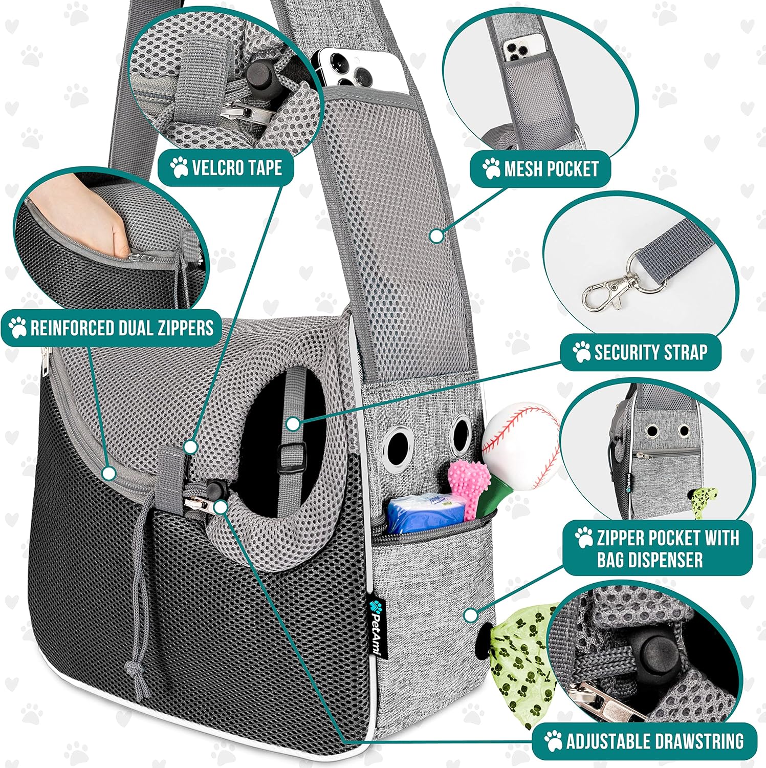 - CROSSBODY PET POUCH PURSE: The dog front carrier comes with a poop bag dispenser feature pocket, a large pocket on the back to store pet stuff, treat, food, toy, and a mesh pocket on the shoulder strap for essential personal items, phone and cards. The strap is adjustable, sturdy and durable, with a reinforced buckle and D-ring on the side for safety and convenience. This cute cat sling carrier chest is easy to wear and carry. Ideal for hands free situation just like puppy back pack and bookbag.