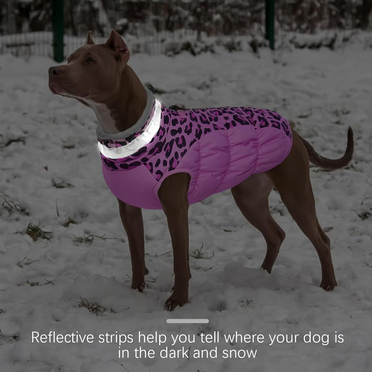 FUAMEY Dog Coat for Large Dogs,Waterproof Dog Winter Jacket with Harness Built in Puppy Cold Weather Coats Reflective Pet Vest with Zipper Warm Fleece Dogs Snowsuit Windproof Pink Leopard XL