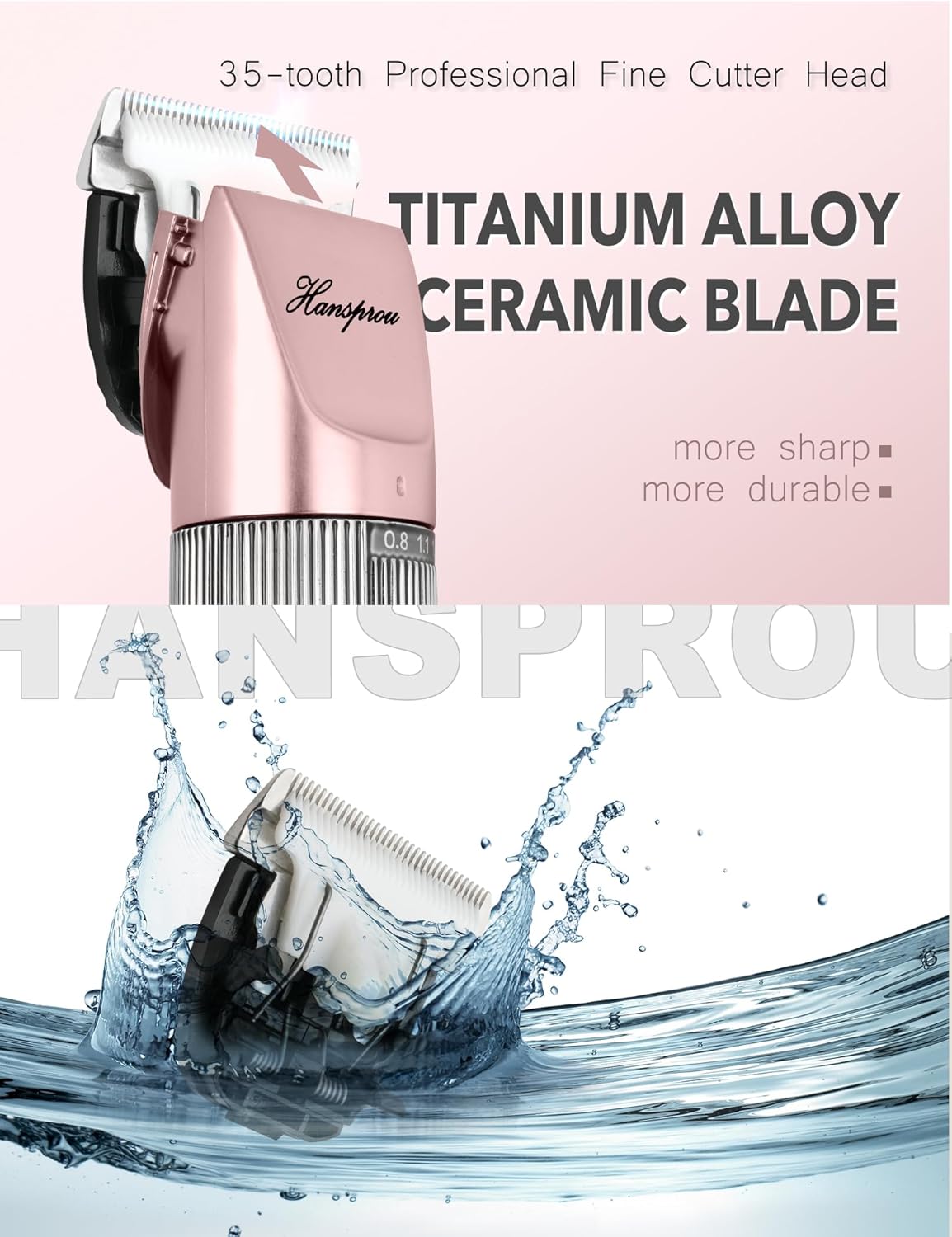 - High Quality Titanium Alloy Blade + Ceramic Moving Blade: Hansprou dog trimmers provide excellent cutting performance for thick coats.Detachable blades are easy to change and clean. Compared with ordinary, Hansprou's special 35-tooth cutter heads are sharper, more durable and more efficient.For example, long-haired rabbits, which can not be cut hair by other clippers, but Hansprou cutter heads can do it