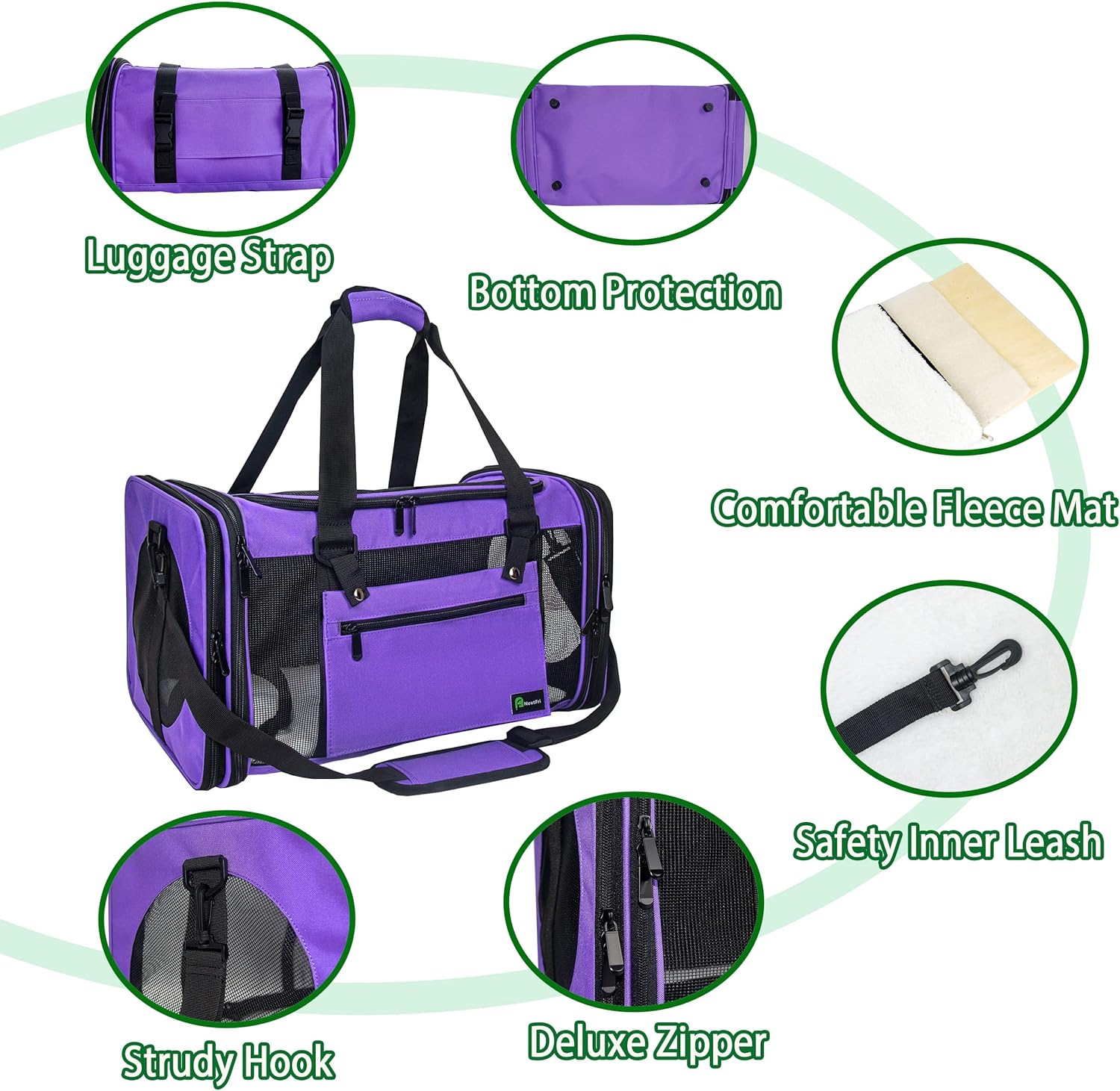 - Carrying handles, adjustable shoulder strap which can also be used as seatbelt, and back strap can fasten the carrier to your luggage