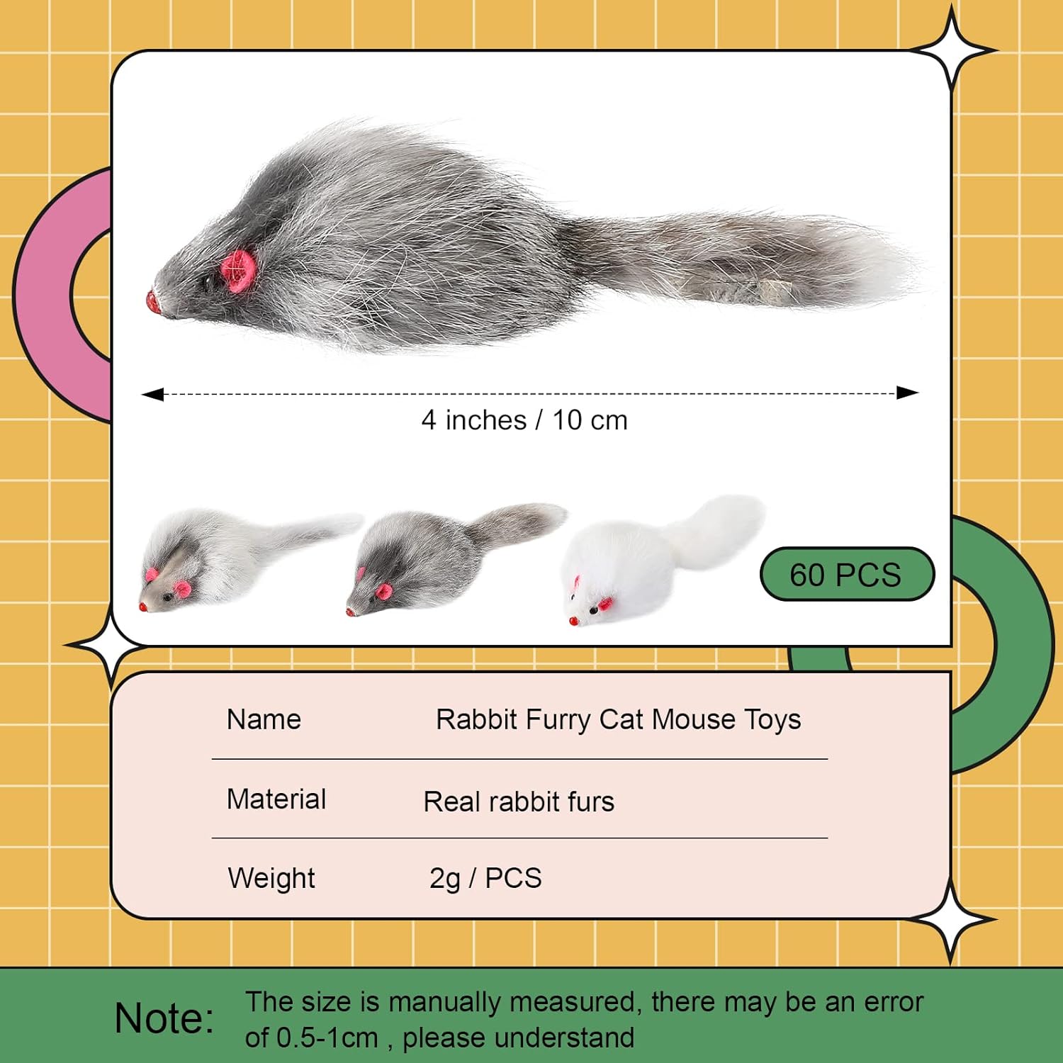 Hungdao 60 Pcs Furry Mice Interactive Catch Play Rabbit Fur Mouse Cat Toy Rattle Sound Rat Plush for PET Cats and Kittens, 3 Colors(White, Black, Gray)