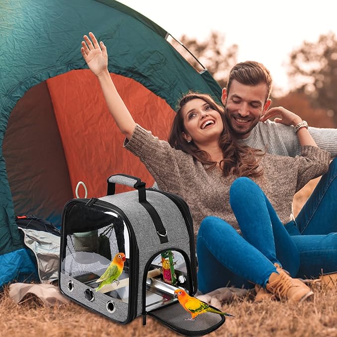 - 【FEEDING & PERCHING】There are 3 in 1 food container, one perch, one hanging bird toy, and one pack of garbage bag come with the bird carrier. It provides a comprehensive care and comfortable environment for birds.