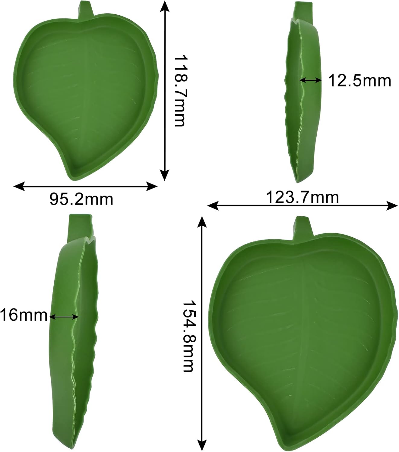 - Small & Large Combination: 2 sizes of the leaf reptile food water bowls, the smaller measures 4.72 x 3.74 x 0.47 inch/ 12 x 9.5 x 1.2 cm, and the larger is 6.06 x 4.88 x 0.59 inch/ 15.4 x 12.4 x 1.5 cm.