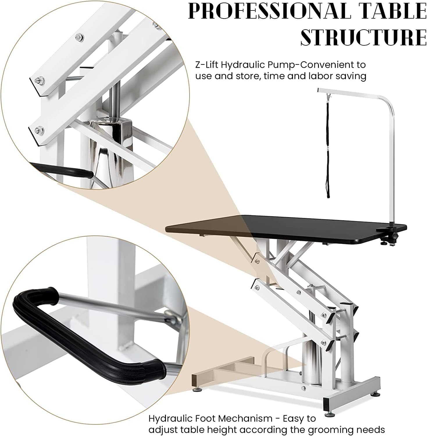 - ¡¾Z-Shaped Hydraulic Lifting System¡¿With a Z-lift base, the dog grooming table can provide extra stability and eliminates wobbling and tipping. You can raise the height of the dogs so that you can reach them easily for bathing, trimming, drying, grooming, or other pet care.
