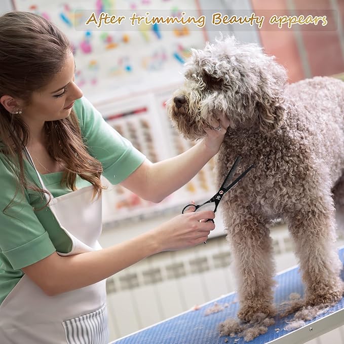 - ★Professional Pet Grooming Scissors Kit★-The kit includes 1 × 7.3-inch thinning shear, 1 × 7.7-inch curved scissor, 1 × 7.7-inch straight scissor, 1 × pet comb, 1 × cleaning cloth, 1 × black leather case