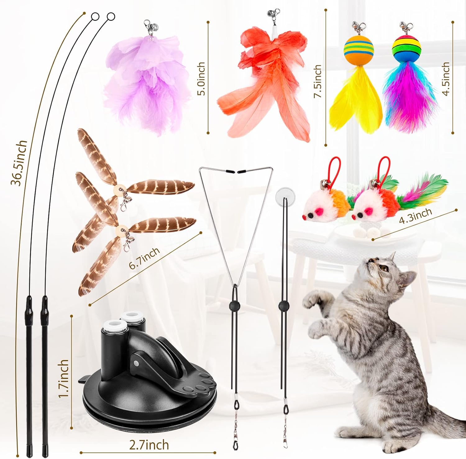 - [3 in 1 Cat Toys Set]- Package contains 2 suction cups, 2 cat wands, 2 fur balls, 2 mice toys, 2 worm toys, 4 feather toys, 2 ropes, 2 sticky pads, 1 triangular clip. All replacements are universal, they are durable and will keep your cat interested.