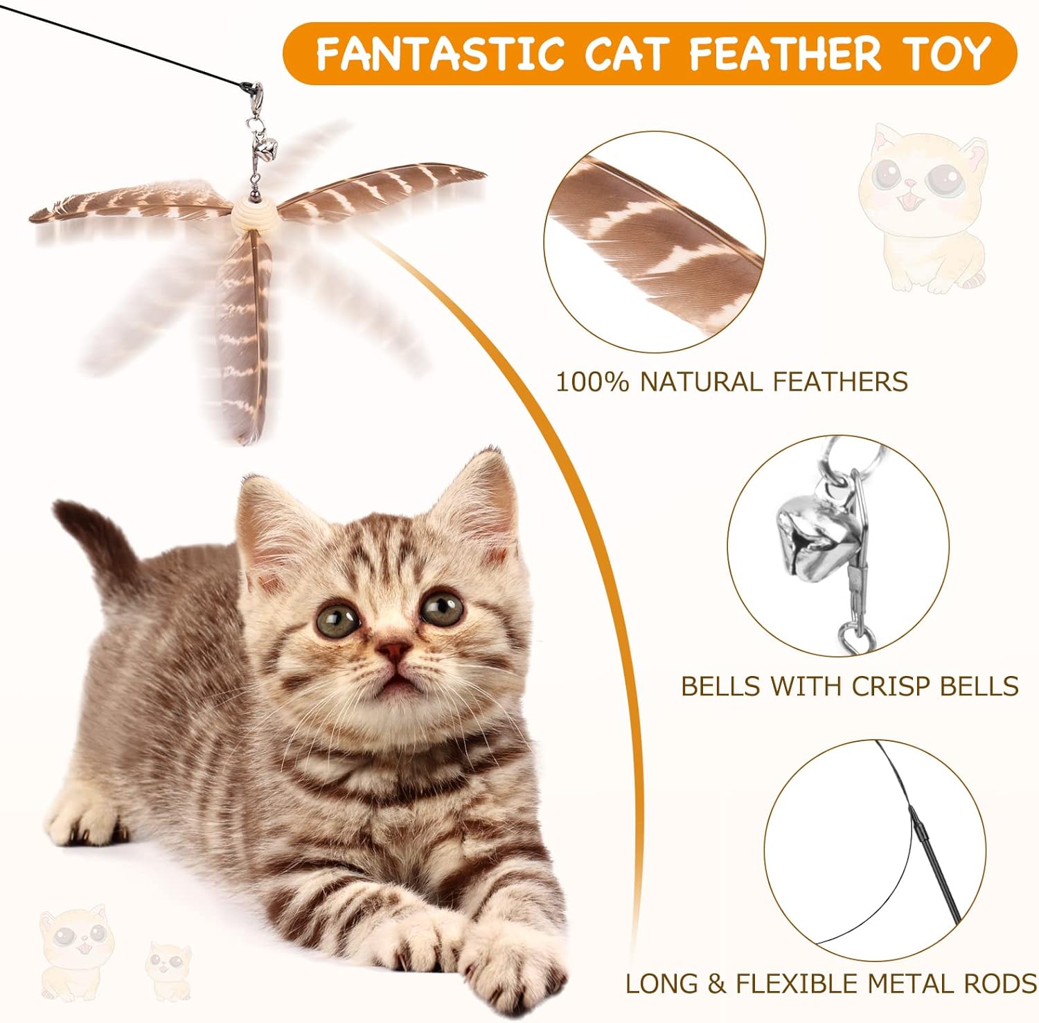 Cat Toys Wand, Interactive Cat Toy with Super Suction Cup Sticky Detachable 12 PCS Feather Replacements 2 Wands Cat Spring Feather Toys for Indoor Cats Kitten Toys (8 Toys Double Headed)