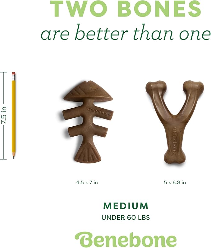 Benebone 2-pack Fishbone/Wishbone Durable Dog Chew Toys, Real Fish, Real Bacon, Made in USA, Medium