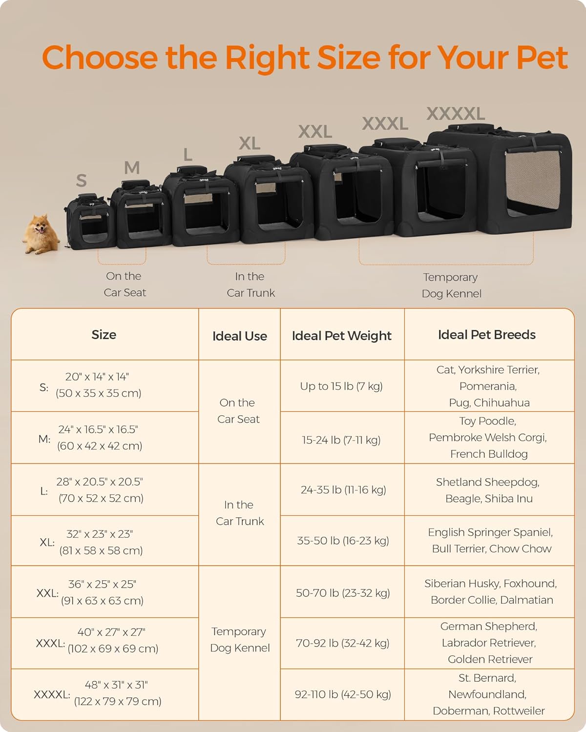 - 【CHOOSE THE RIGHT SIZE】This 40" x 27" x 27" collapsible dog carrier is ideal for pets between 70-92 lb. Please read our tips on the pictures to measure your pet and choose the right size