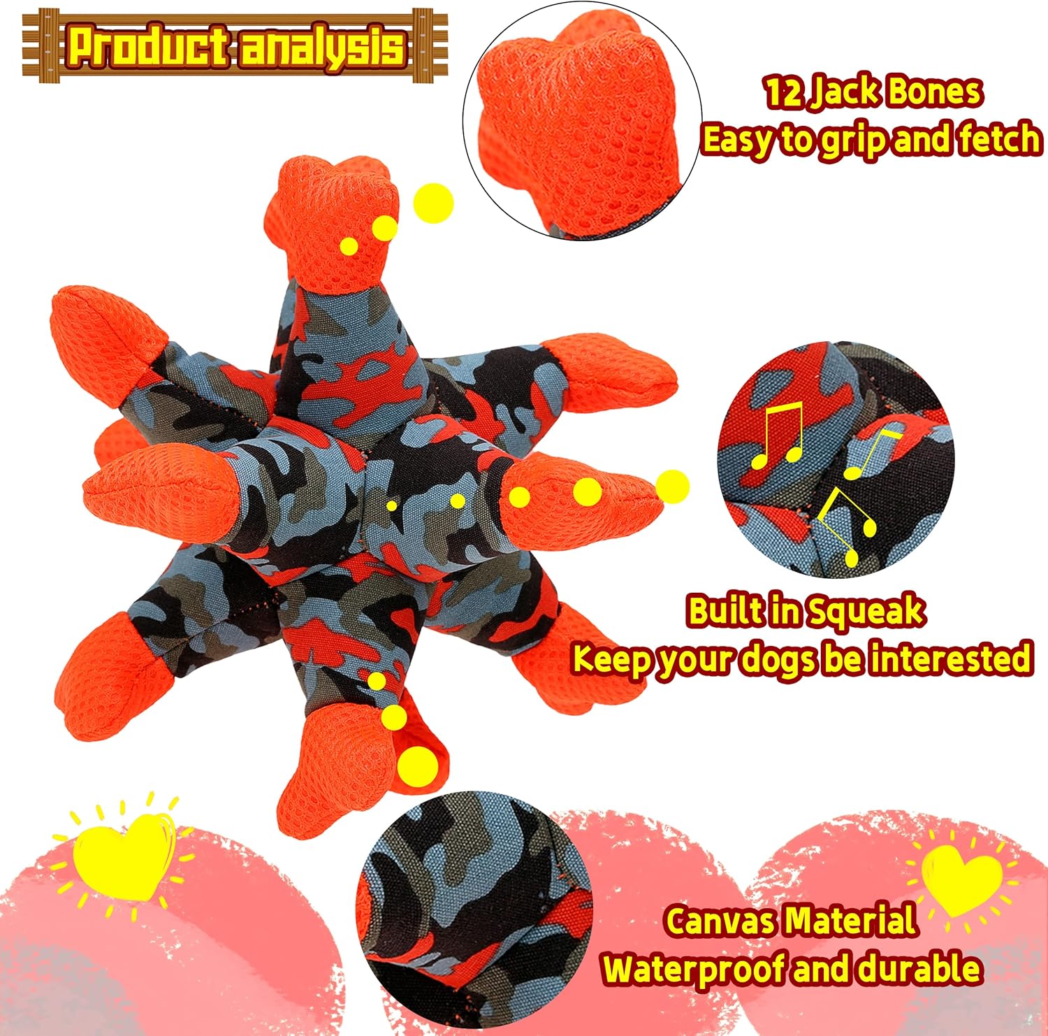 - Unique Design - Dog canvas chew toys are made of twelve soft salient stuffed bones which are flexible, This funny big dog toy is designed with jack shaped, easily thrown and kicked out like a soccer ball, bounces well, so it's fun for the dog to fetch