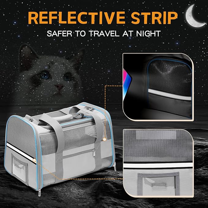 - ๐ฅฐใSafe and DurableใCat Carriers for Medium Cats Under 25 is made of durable, lightweight and waterproof polyester fabric. This soft-sided cat carrier comes with four-sided mesh and three-sided entrance giving plenty of openings and air for cat dog with top opening. With zippers on both top and side, your lovely puppy can be put in and out of our dog carrier easily.