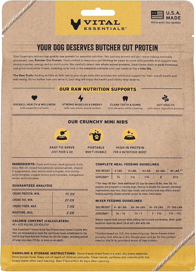 - CRUNCHY FREEZE-DRIED RAW DUCK DOG FOOD: Vital Essentials Crunchy Freeze Dried Dog Food packs more protein than industry standard into every bite to deliver the peak vitality your dog deserves, especially when compared to dehydrated dog food. This complete and balanced freeze-dried raw dog food is made with premium butcher cut duck, responsibly sourced in the EU.