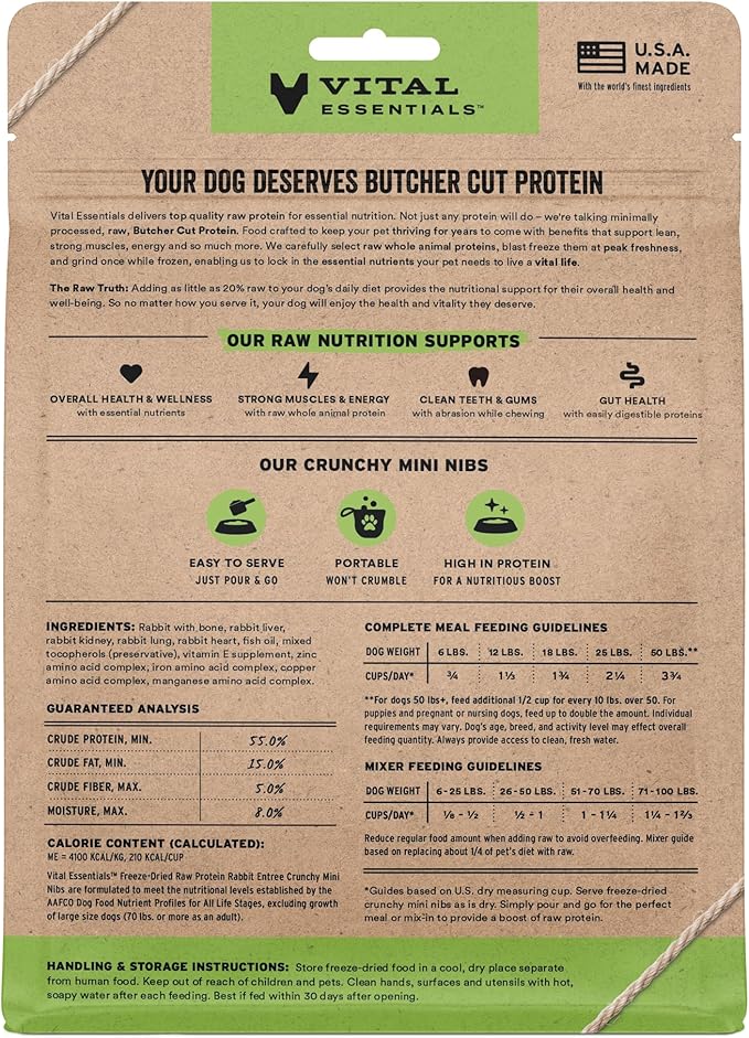 - CRUNCHY FREEZE-DRIED RAW RABBIT DOG FOOD: Vital Essentials Crunchy Freeze Dried Dog Food packs more protein than industry standard into every bite to deliver the peak vitality your dog deserves, especially when compared to dehydrated dog food. This complete and balanced freeze-dried raw dog food is made with premium butcher cut rabbit, responsibly sourced in the EU.