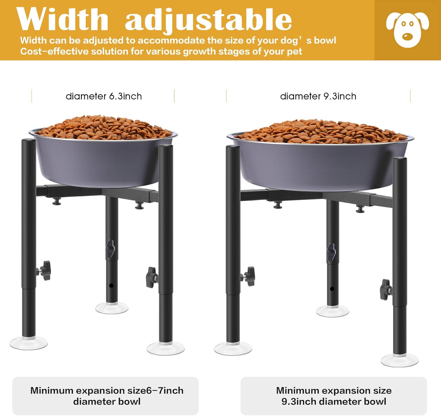 - Cater to pets’ growth: Our dog food bowl stand is designed with pets’ changing needs in mind. With four height settings (14, 11.6, 10.4, 8.2 inches) and four width options (11.7, 9.3, 8.1, 5.9 inches), it gives a tailored feeding experience as pets grows from a puppy to an adult