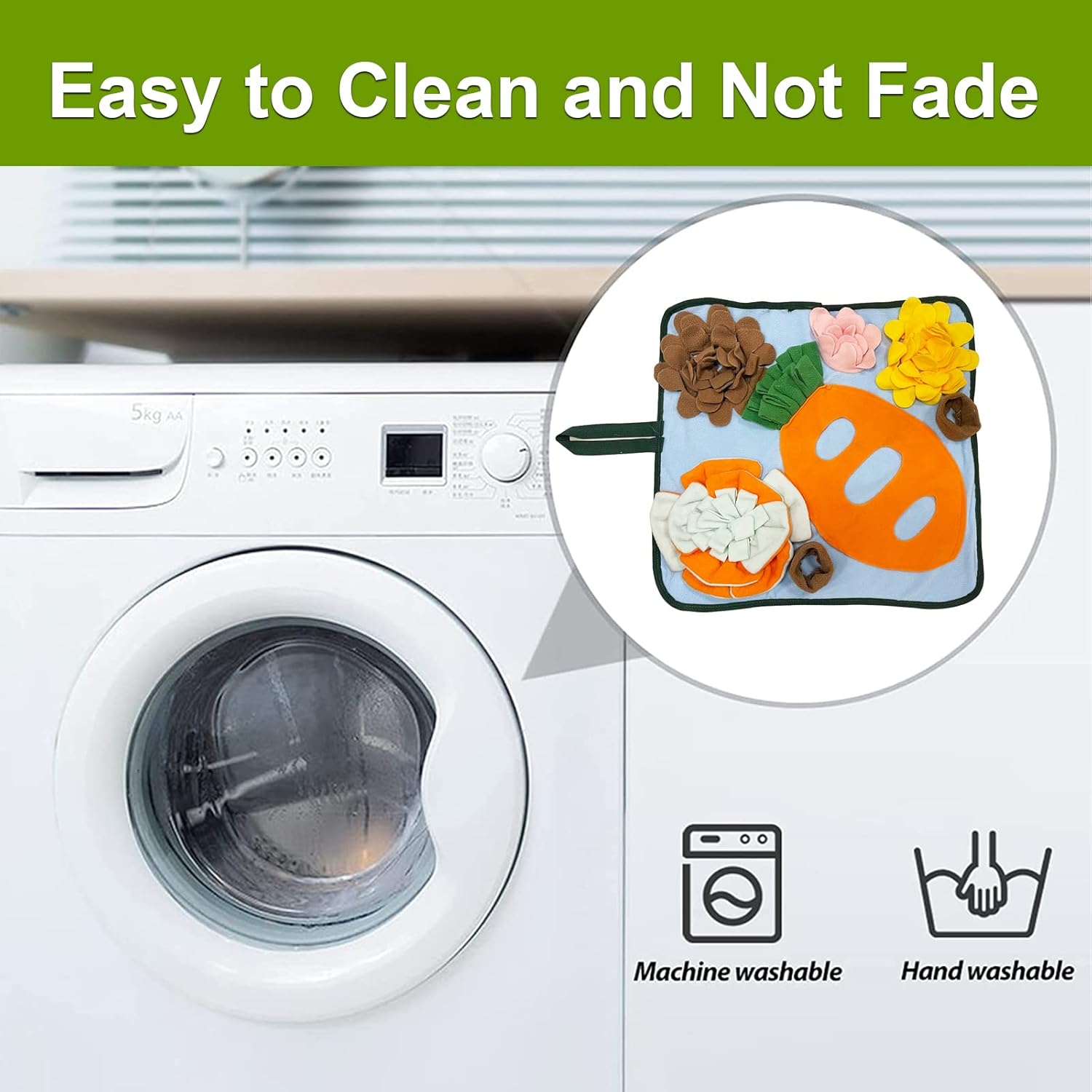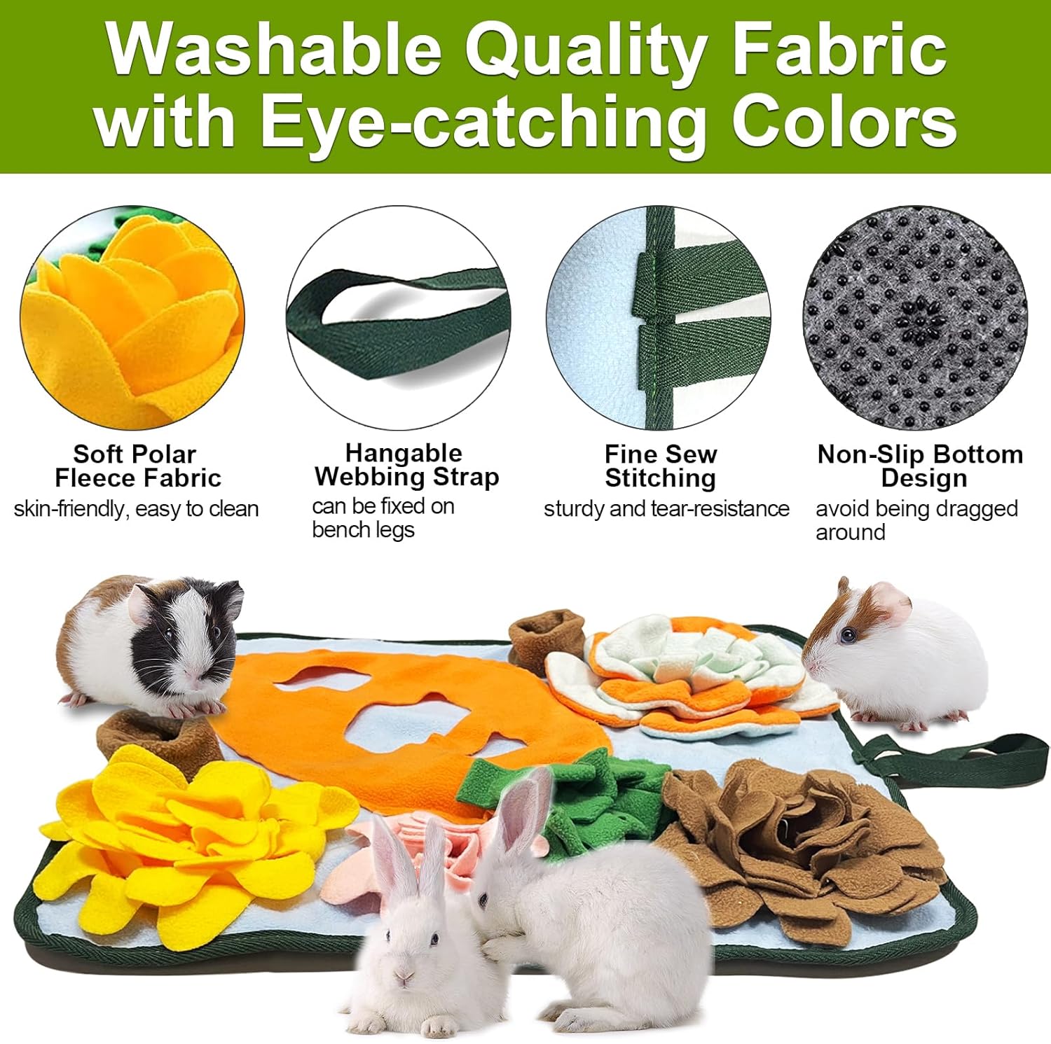 - 【Funny Pet Foraging Mat for Rabbits】This pet snuffle mat features flowers in different eye-catching colors and shapes to hide food, and there is also a carrot-shaped area that can hide hay and vegetables inside. These unique patterns can hide a lot of treats and evokes your adorable pet to go foraging.