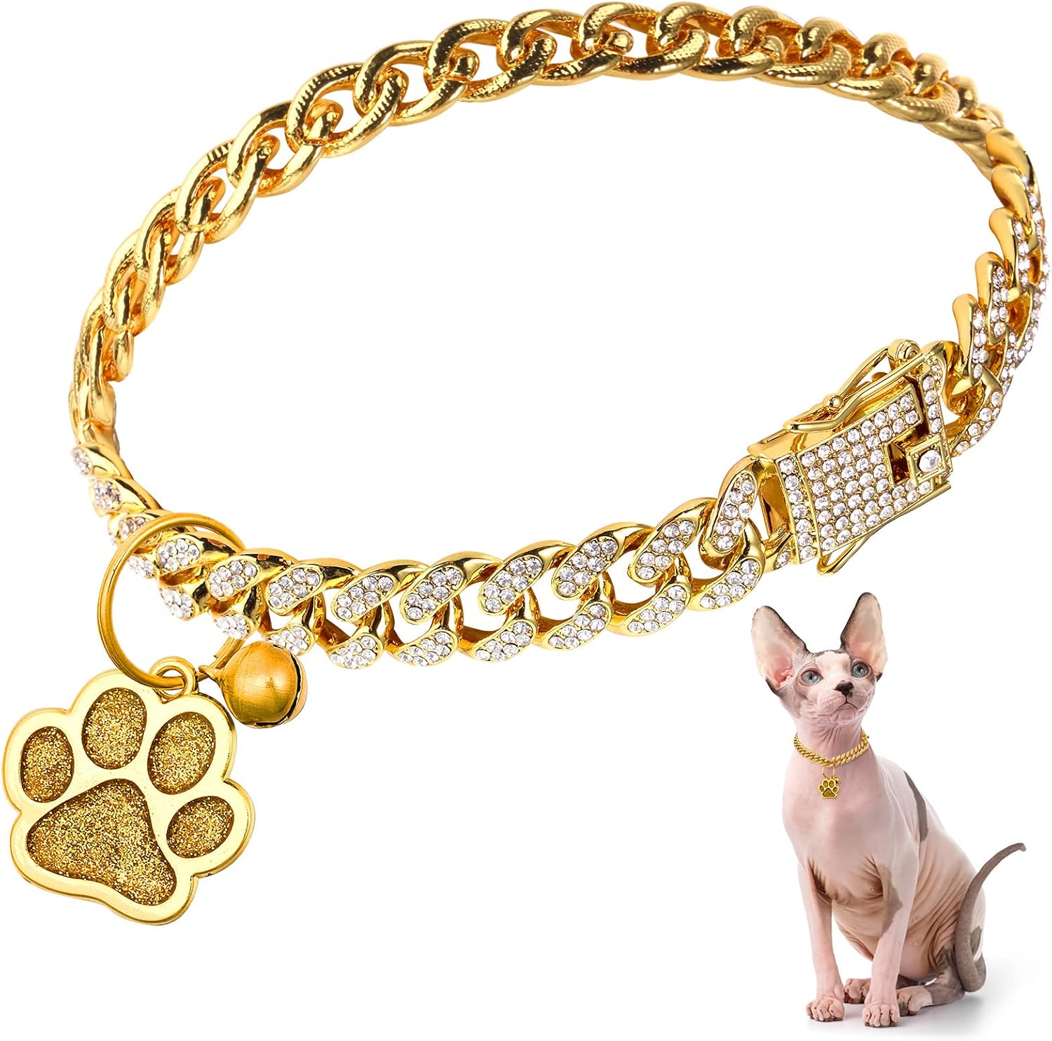 Hillban Cat Collar Diamond Chain Glitter Collar Walking Metal with Secure Buckle Cat Pet Necklace with Paw Charm and ID Tag Bell Link Cuban Jewelry Accessories(10 Inch,Gold)