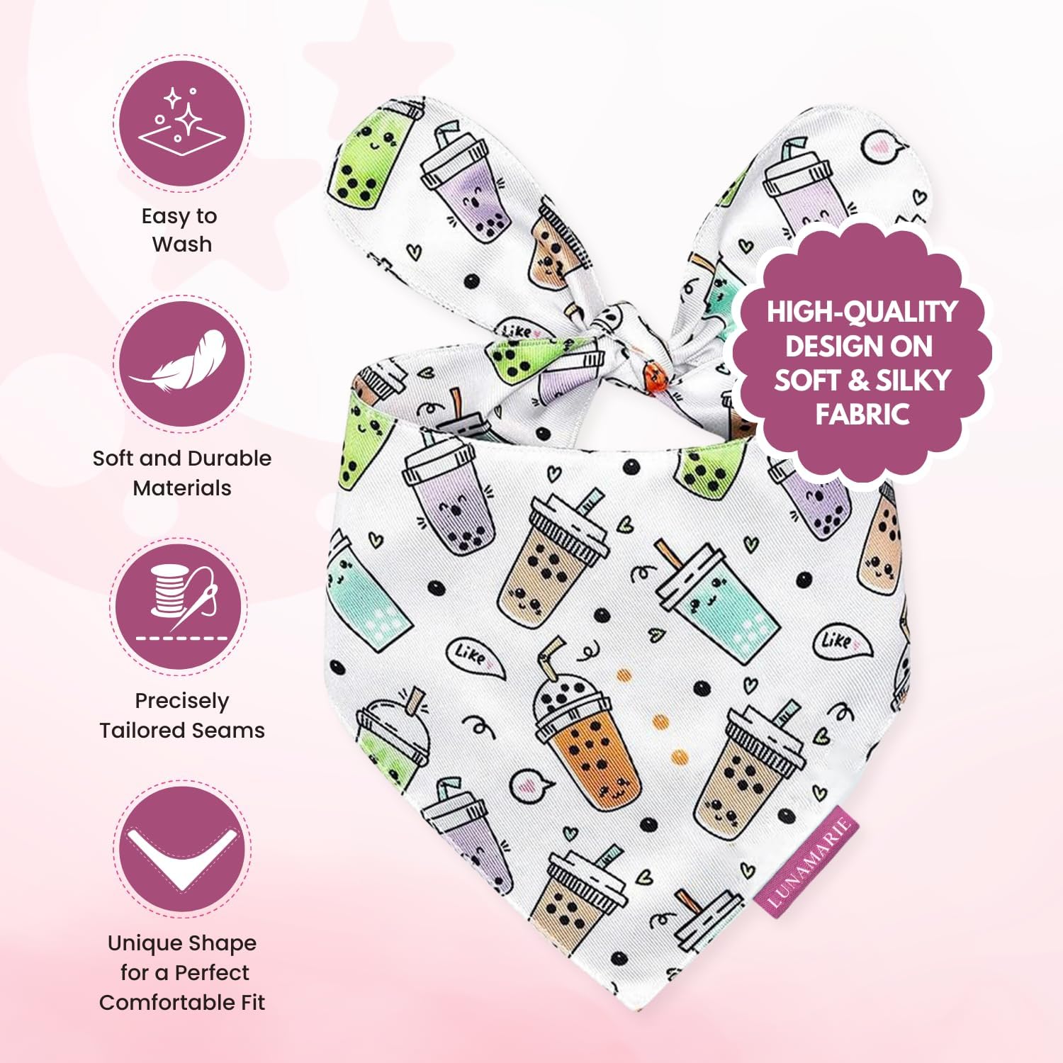LunaMarie - Luxury Pet Birthday Bandanas -Premium & Silky Poly Fabric | 100% Handmade | Custom Shape Dual Layered (Boba, Small)