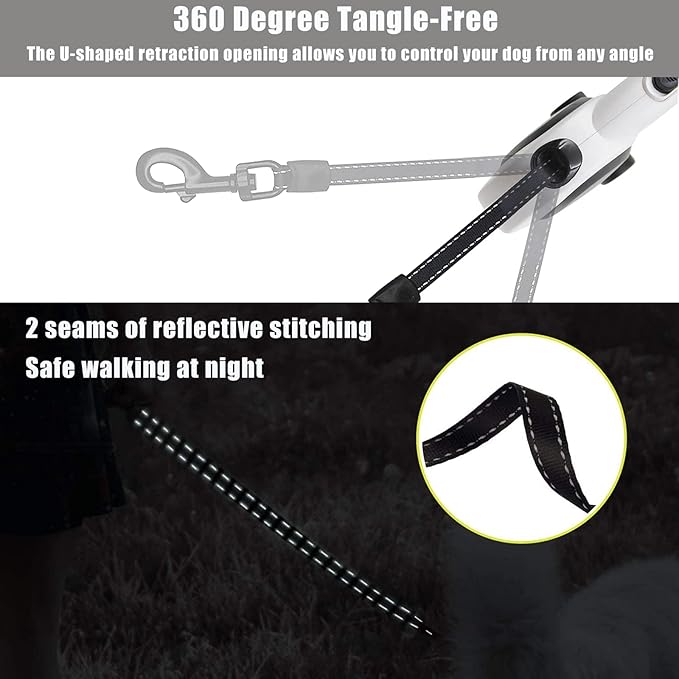 - ๐ใEasy to Use & ControlใOne-handed brake, pause, lock and unlock, quickly adjust the distance between you and your dog, and keep your dog safe. 360ยฐ tangle-free makes retracting easier and smoother, and the U-shape opening design allows you to control your dog from any angle. This is a great design for owners who want to give dogs more freedom while remaining safe and in control at all times.